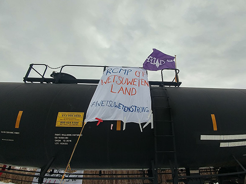 “The Wet’suwet’en people, under the governance of their hereditary chiefs, are standing in the way of the largest fracking project in Canadian history,” Sleydo’ said in a statement prior to her arrest. “Our medicines, our berries, our food, the animals, our water, our culture, our homes are all here since time immemorial. We will never abandon our children to live in a world with no clean water. We uphold our ancestral responsibilities. There will be no pipelines on Wet’suwet’en territory.”