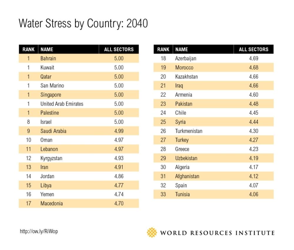 “The region, already arguably the least water-secure in the world, draws heavily upon groundwater and desalinated seawater, and faces exceptional water-related challenges for the foreseeable future,” WRI warned. The top three countries and eight of the top 10 on the Institute’s water stress list are in the Middle East.