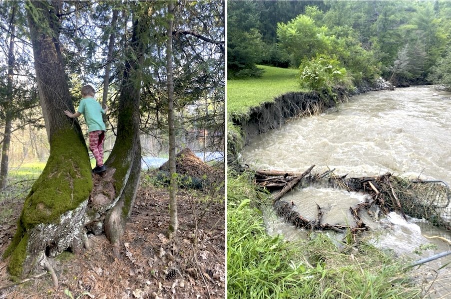“The next morning, we checked on the permaculture garden we’ve cultivated over years, and the small cedar grove by the creek—and it was gone. All gone. A couple of hundred metres of land were torn away and carried off with the flood. No sign of the tall, mossy trunks that held us through COVID and became a solace. Huge, gnarled roots stuck out of the earth, which stopped abruptly where it had been torn away. Soil and logs and tomatoes and plastic garbage lay across the meadow, with signs that everything was under water while we slept.